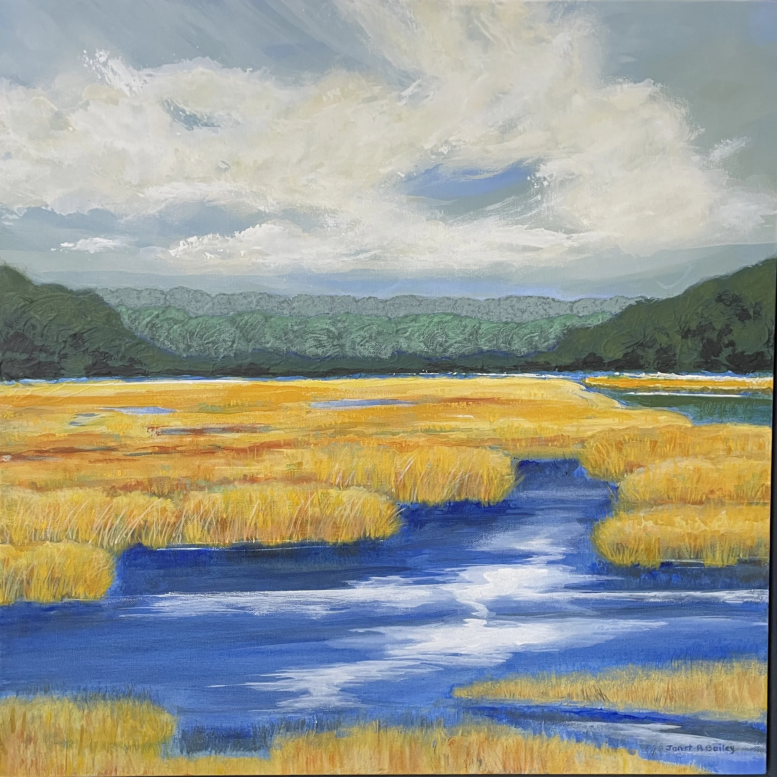 ARTWORK STATEMENT: The spring and fall marsh varies in beautiful hues. But unseen is a nutrient-rich wetland that is the vital nursery for an array of plants and animals, including herons, shellfish and small mammals.