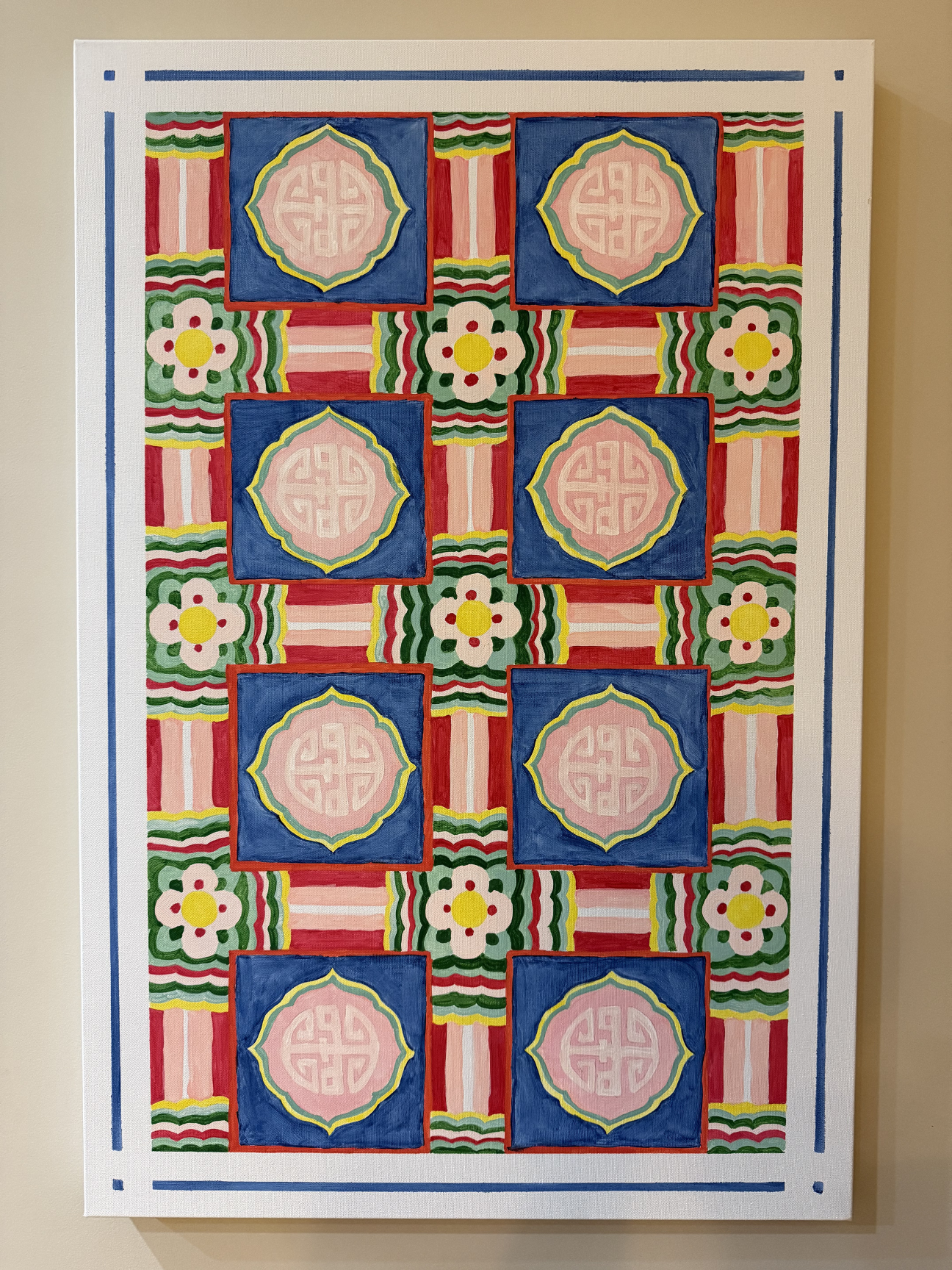 ARTWORK STATEMENT: This is inspired by the ceiling work seen in traditional Korean palaces. The style is called "dancheong" and is characterized by striking, complex, and repetitive geometric or floral patterns. The character in the center of the medallions means harmony.