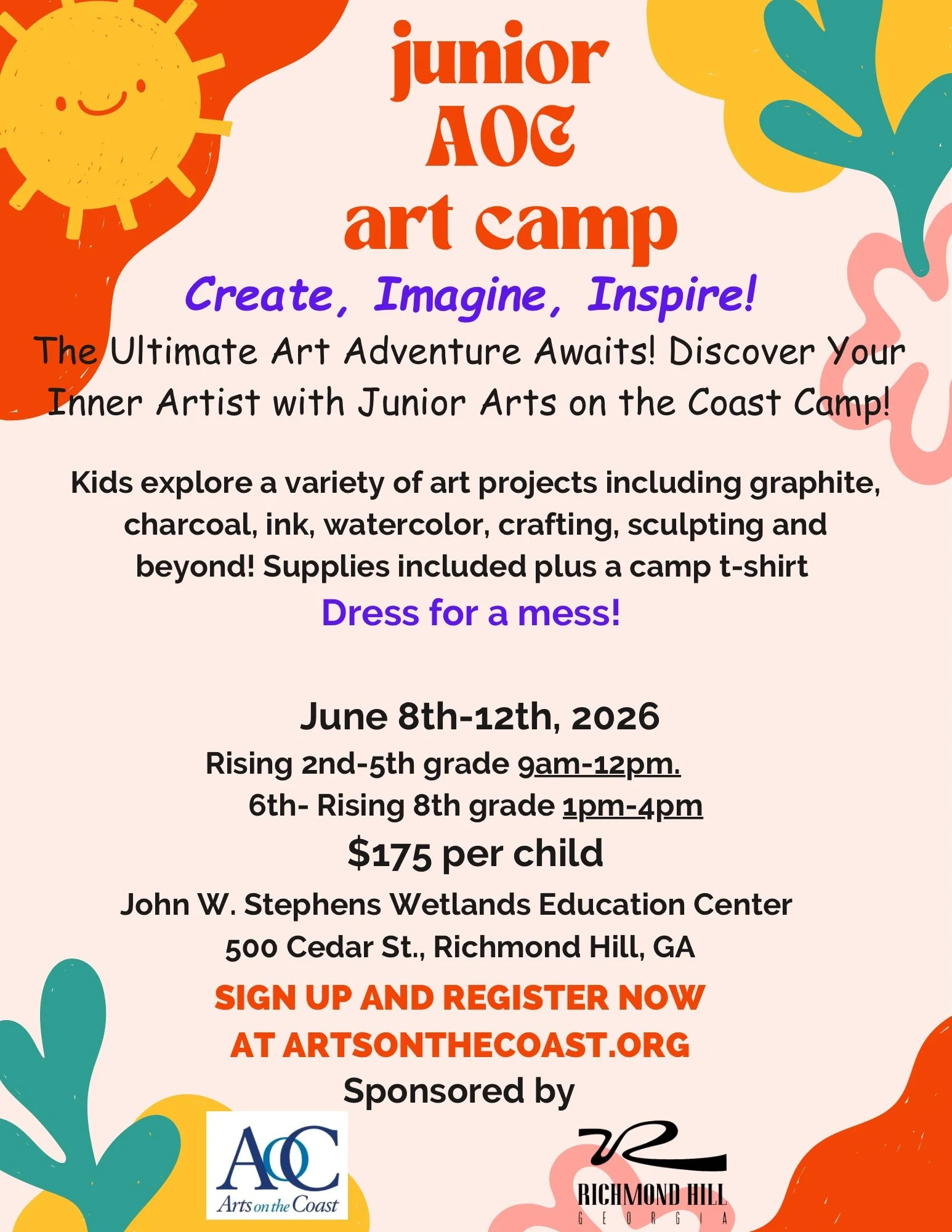 Taking place June 8–12, 2026, camp will be held at the John W. Stevens Wetlands Education Center (500 Cedar Street, Richmond Hill, Georgia). Surrounded by the natural beauty of the wetlands, students will draw inspiration from both environment and instruction as they explore a diverse range of artistic mediums.