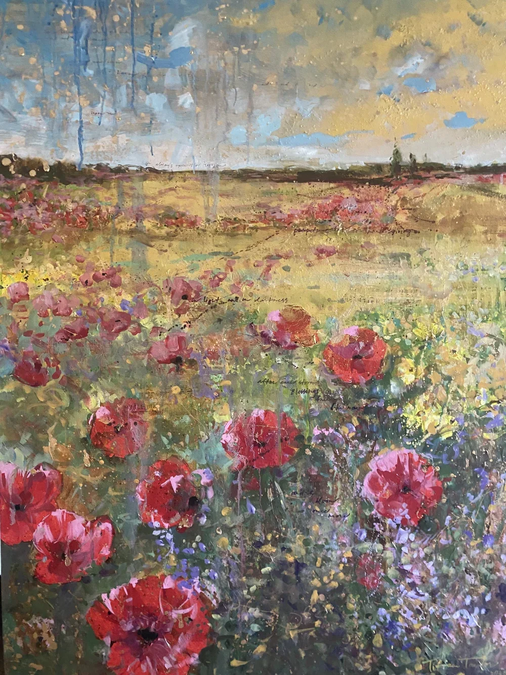 ARTWORK STATEMENT: This painting was created from memories of meditation in nature. The flowers are a combination of the poppies of my youth, as well as the blooms I meditated upon in both France and Italy. This is a work of hope, that despite external circumstances, we can look for peace within and keep hope in our hearts even during adversity. Hope, always hope, on the horizon...